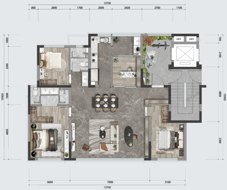 ③拆掉公区卫生间,让餐客厅升级为55㎡超大空间(独栋别墅才享有的大空间)