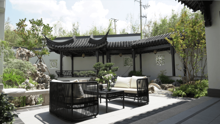 建筑是一种媒介,使人感受自然的存在。灰瓦粉墙、围合布局、前庭后院、木色凸花窗、中式屋檐、中式宅院门第、镶铜雕花木门、以及抱鼓石和砖雕等