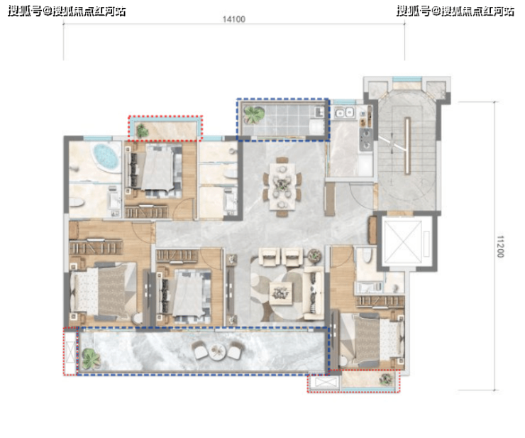 建筑面积约:141-143㎡,四室两厅三卫+双阳台
