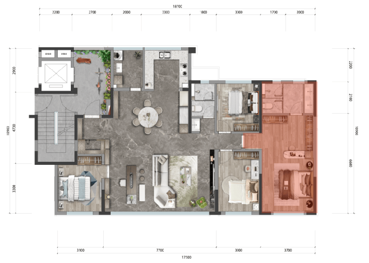 【航母级主卧套房】:比别人客厅还要大的主卧套房,约33㎡主卧套房,3.7米大开间+15㎡至20㎡起居室+双台盆卫浴空间+超大独立梳妆衣帽间