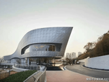 跨度达37米,高约7米,顶部运用了加穿孔铝板吊顶打造的星空顶,每当夜幕降临,超尺度定制灯箱亮起,漫天繁星闪耀,照亮业主回家的道路。