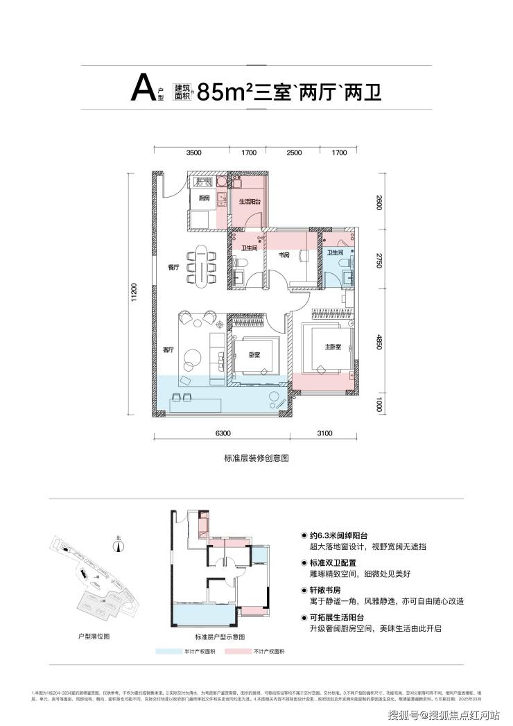 在售85-142㎡迭代新规户型,梯户比2T4、2T6,涵盖全功能三房至舒适四房。户型亮点突出,小面积大空间,部分户型南北通透、端头全明,动线合理,适配刚需、改善等不同家庭,性价比突出。