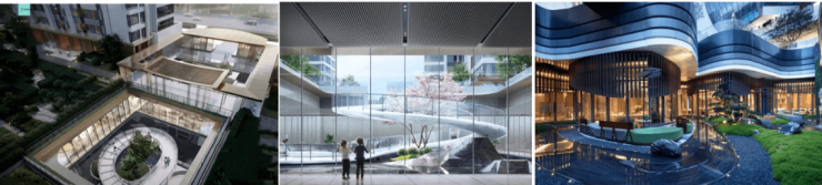 打造三重式归家仪式,第一重为视野敞阔的地下车库,打破传统地库入户方式,改变黯淡的空间,第二重为首层入户大堂,在入口的设计上,运用北京颐和安缦风,通过中轴的格局与建筑和植物的烘托,构建出具有中国特色的入户大门,高约5.5米,打造开阔通透的入户空间,第三重为电梯厅,一梯一户的归家礼遇,为居住者营造私密安静的生活氛围。