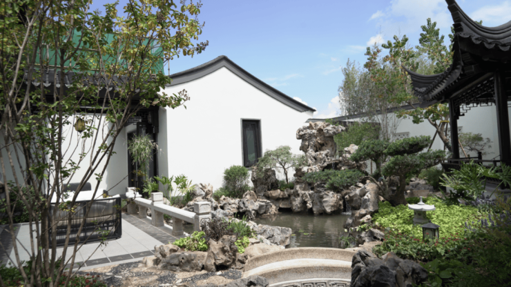建筑是一种媒介,使人感受自然的存在。灰瓦粉墙、围合布局、前庭后院、木色凸花窗、中式屋檐、中式宅院门第、镶铜雕花木门、以及抱鼓石和砖雕等