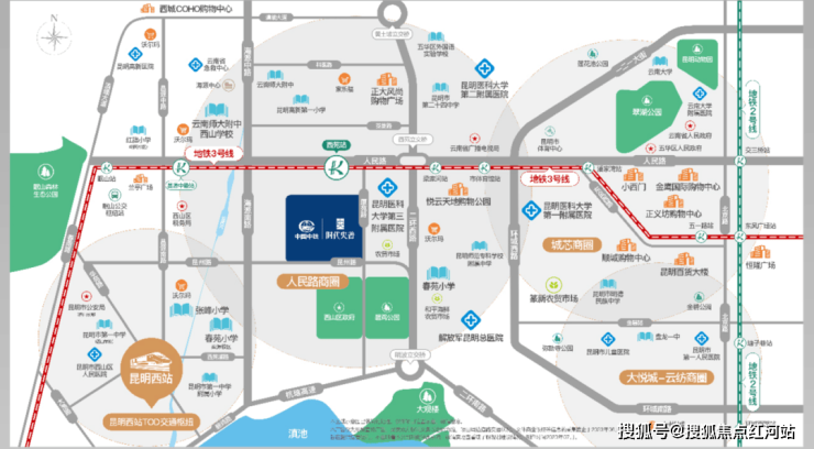 项目雄踞西二环城市中轴,占位城芯核心地段,三横三纵立体路网(滇缅大道、人民西路、碧鸡路;海源路、西二环、环城西路),约200米直达地铁3号线西苑站,近邻在建高铁西客站,5分钟畅达全城,10分钟覆盖主城核心商圈、三甲医院,地段稀缺、交通便捷,资产保值增值能力拉满。