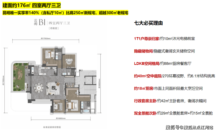 针对第四代住宅的隐私痛点,项目进行迭代升级,采用奇偶层错位布局+空中隔断设计,上下层视线无交集,既保障空中花园的私密性,又不影响采光通风。同时,户户打造270°全景舱落地环幕视野,摒弃传统住宅的窄窗局限,将滇池路城市景观、社区雨林园林、滨河公园景致尽收眼底,实现“户户有景、窗窗见绿”的居住体验,视野开阔度远超片区普通豪宅。