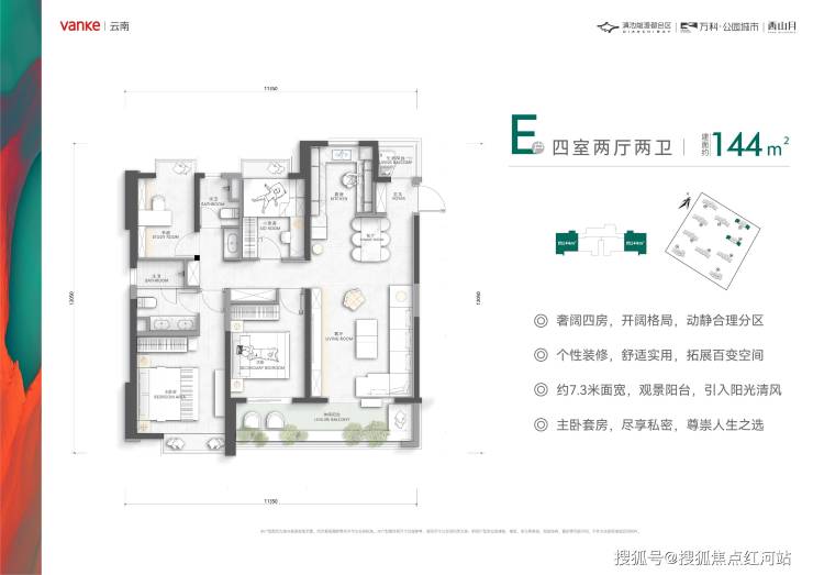 高性价比户型:141-144㎡四室两厅两卫,端户设计,独立入户玄关,7.3 米开间景观大阳台,270 度风光视野,内嵌式收纳墙,空间利用率高。