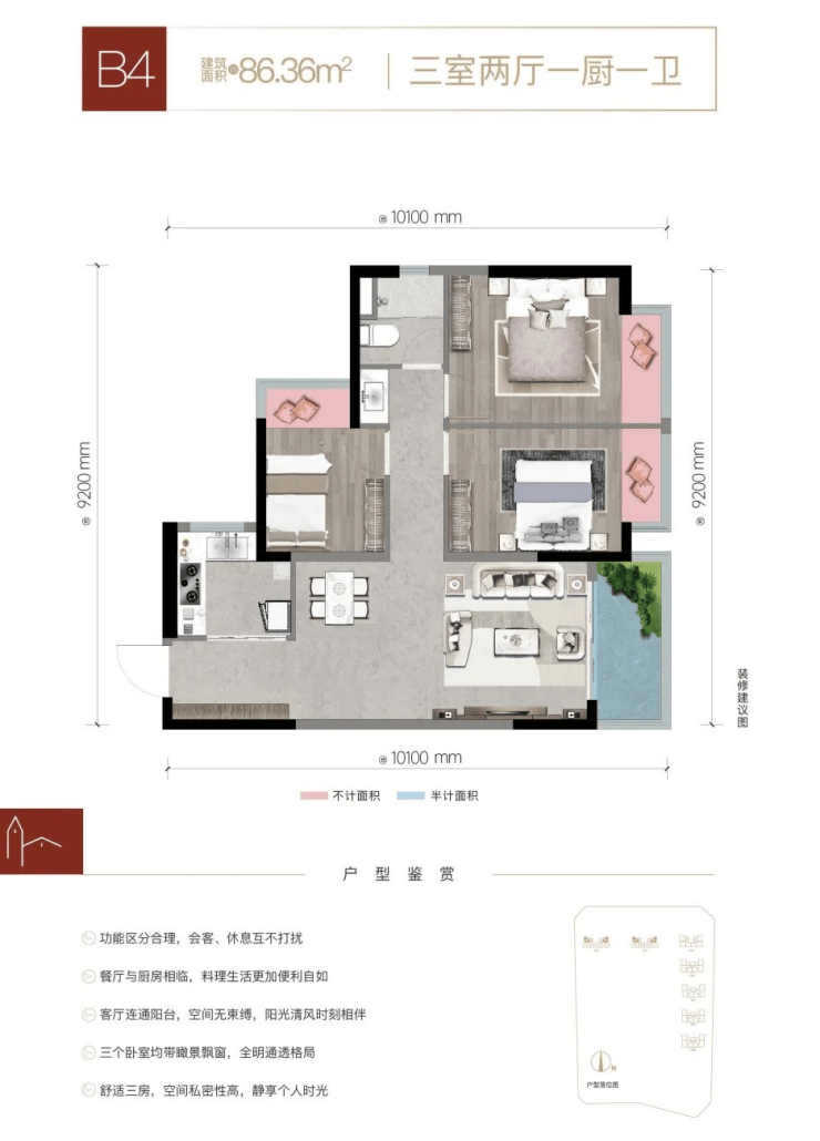 户型设计合理:高层建筑面积约86-117㎡,赋予室内空间优越的采光和开阔的视野。