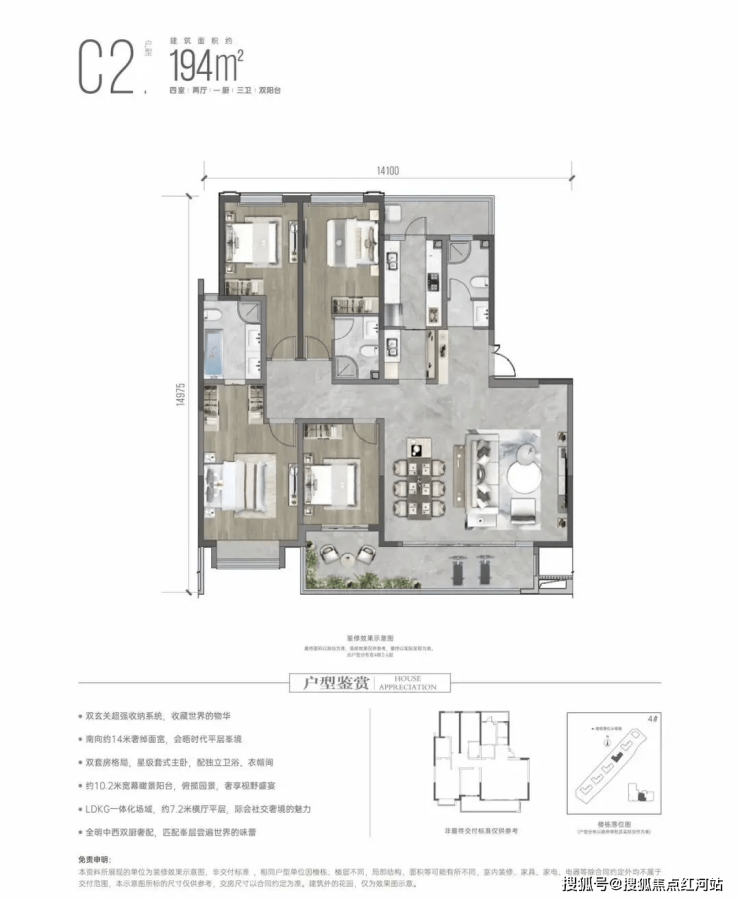 天际平层:南北通透的大四居设计,多开间朝南,餐客一体横厅连接观景阳台,采光视野俱佳,适合追求舒适大平层的三代同堂家庭;