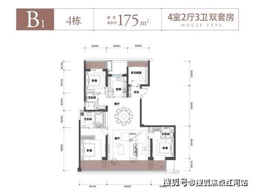175㎡ 四室两厅三卫(舒适改善):LDKB 一体化横厅设计,约 7.2 米超大景观阳台,双套房布局,兼顾了家庭互动与长辈隐私。