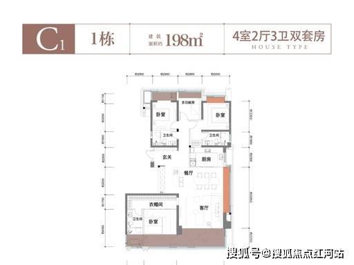 198㎡ 四室两厅三卫(进阶改善):大面宽设计,客餐厅分区合理,空间感强;双阳台 + 多飘窗,赠送面积可观;主卧带独立卫浴、衣帽间与飘窗,舒适度拉满。
