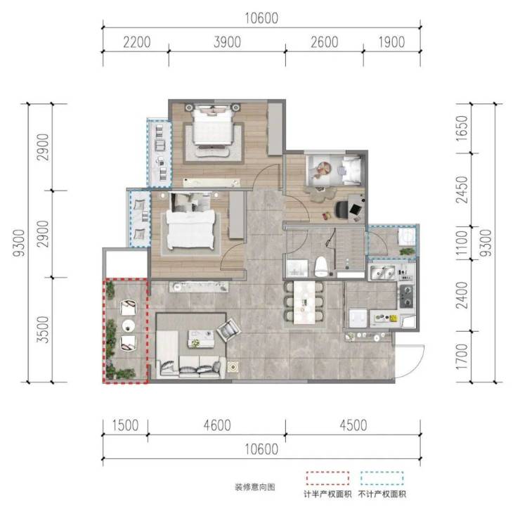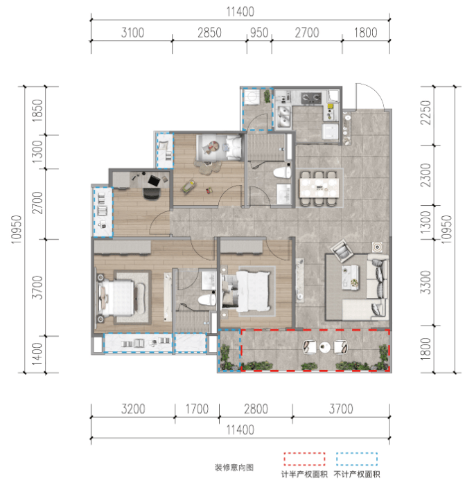 建面约105㎡,三房两厅两卫设计,南北通透,同样动静分区双阳台。