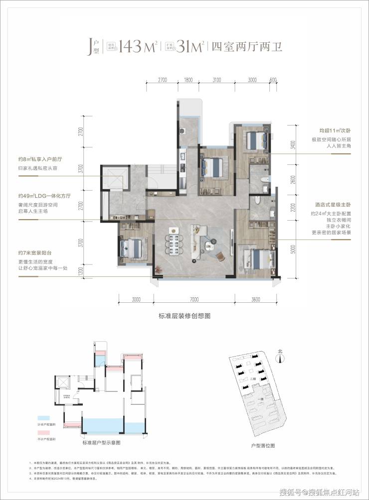 J 户型:1T1 四房双卫,拓展面积约 31㎡,纯板式南北通透,户型方正,适配多代同堂的改善需求。