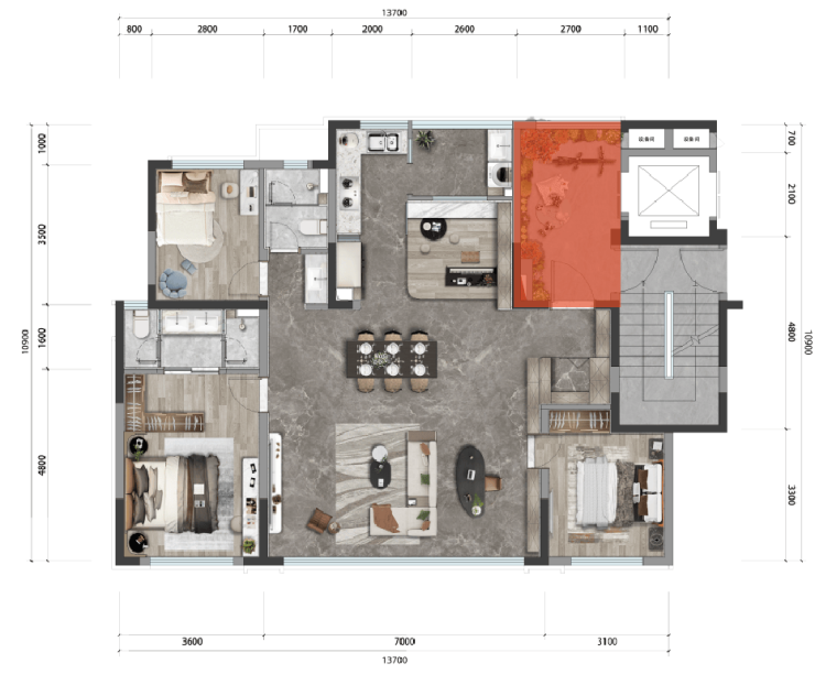 ③拆掉公区卫生间,让餐客厅升级为55㎡超大空间(独栋别墅才享有的大空间)