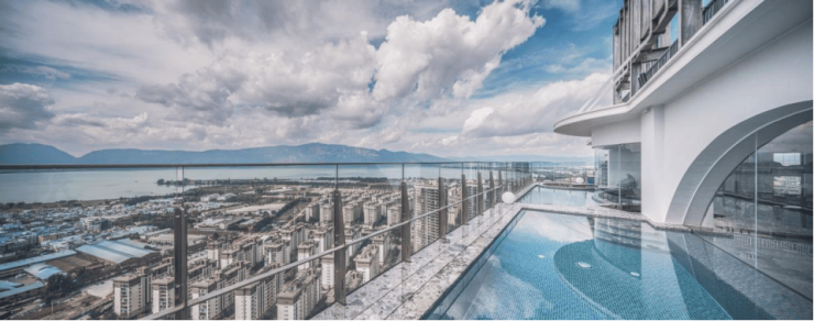 矗立在约130米高空的“天际会客厅”,在视觉和功能性方面的迭新外,更兼具了商务洽谈、社交聚会等功能,同时环幕落地玻璃,使得会所拥有优质的采光面,在这里不仅可以在天际泳池边俯瞰滇池全貌,更能站在270°环形大阳台上远眺昆明的城市夜景。