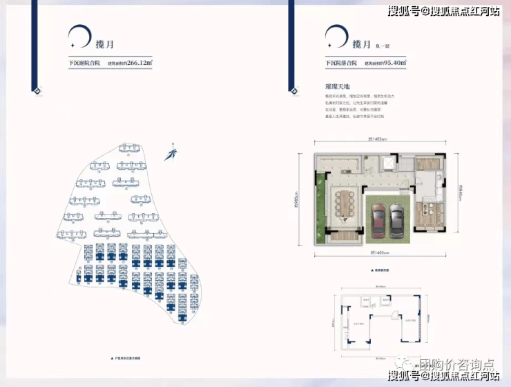 合院产品户型:地面3F+地下2F,下沉式双花园别墅,得房率超150%,面积220-260㎡,花园赠送40-400㎡,总价263万起