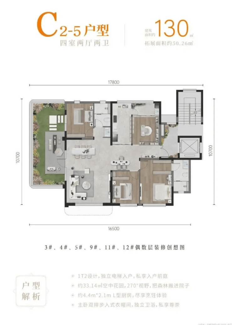 项目占地约56亩,容积率低至2.1,拟建17栋总高9层的洋房,建面约104-130m²户型,均带25-33m²空中露台,得房率高达136%-252%。