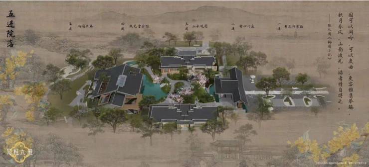 园区内,曲径通幽、兰亭遗风、春秋美景、山水胜景、桂林如海等四季美景交相辉映,共同展现中式园林的极致美学。融合东方园林美学与现代生活场景,匠心独运的五重递进式院落布局,营造出尊贵的五进归家礼仪。在这里,移步换景,尽享四季变换的游园之乐,彰显非凡品味与生活意境。