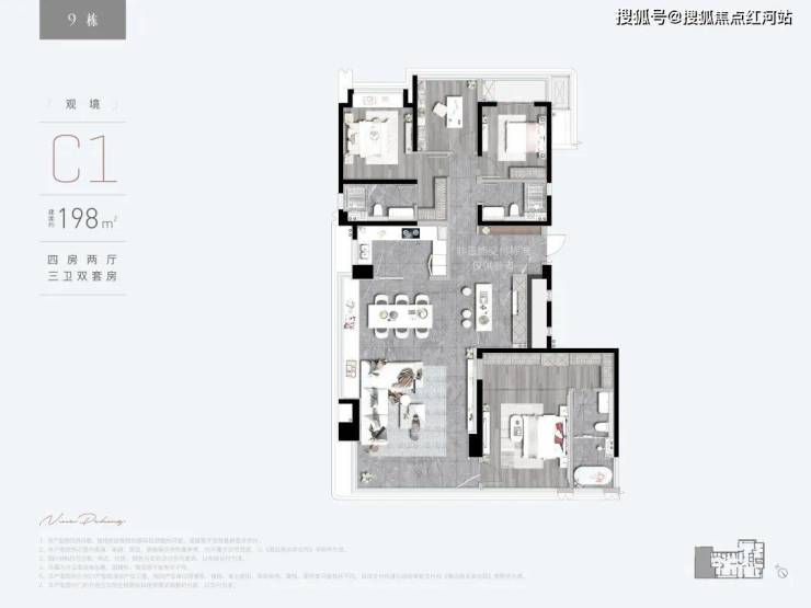 C1观境:建面约198㎡ 四房两厅三卫双套房