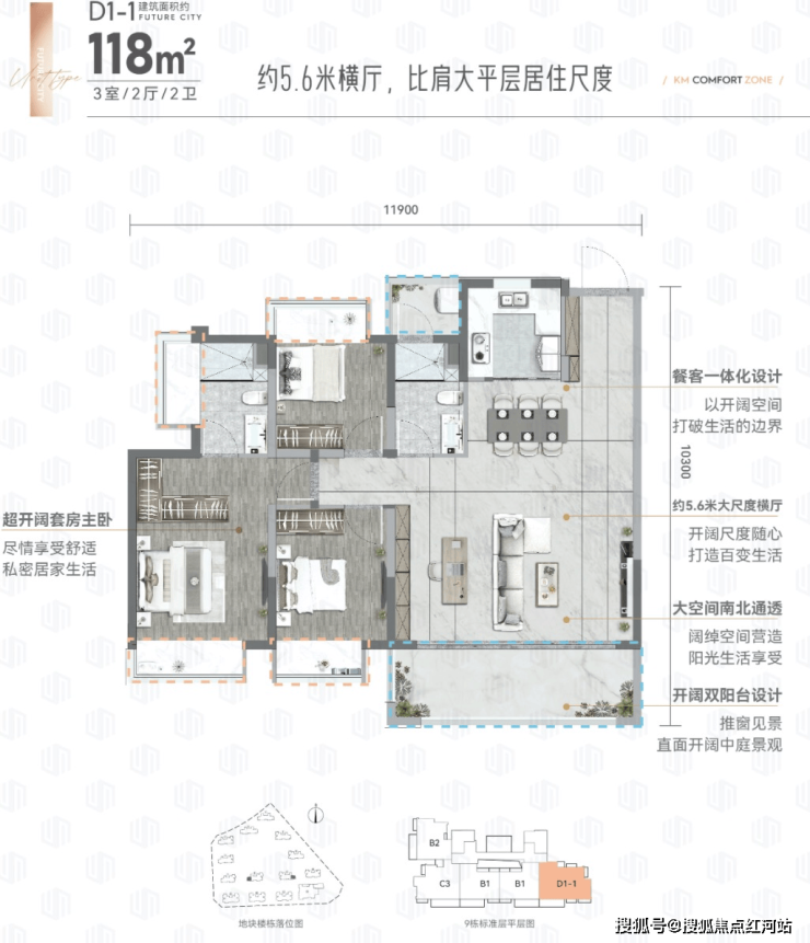 118㎡三房两厅两卫:约5.8米横厅设计,比肩大平层居住尺度,可变四房,空间灵动,双卫设计,主卧套房带飘窗,适合二孩家庭,两个孩子各有独立房间,学习、休息互不干扰,居住更舒展。