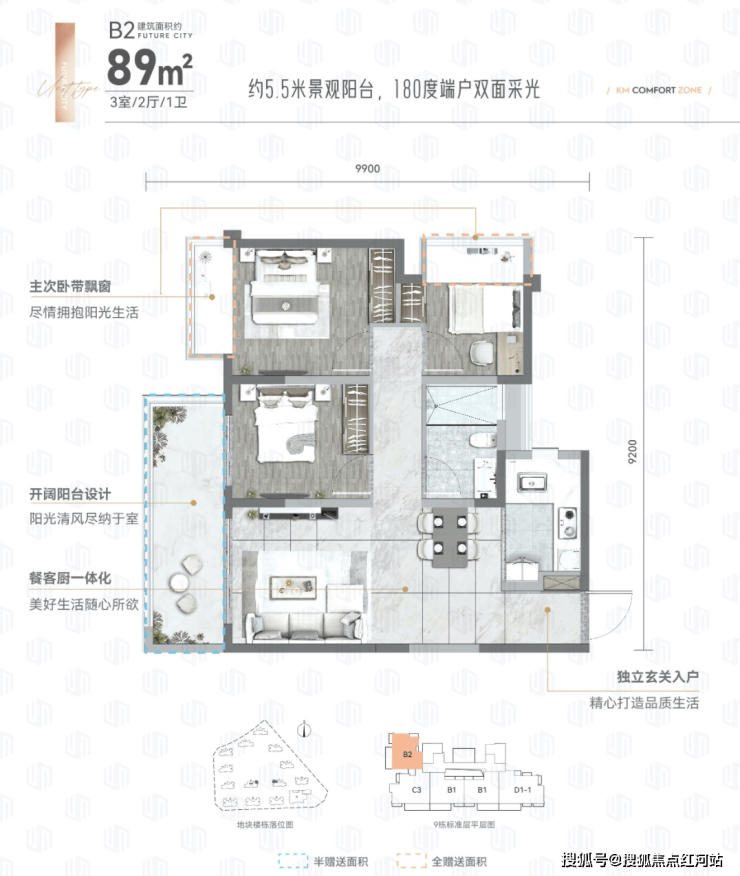 89㎡三房两厅一卫,坐拥5.5米景观阳台,端户享180°双面采光,南向户型采光通透;