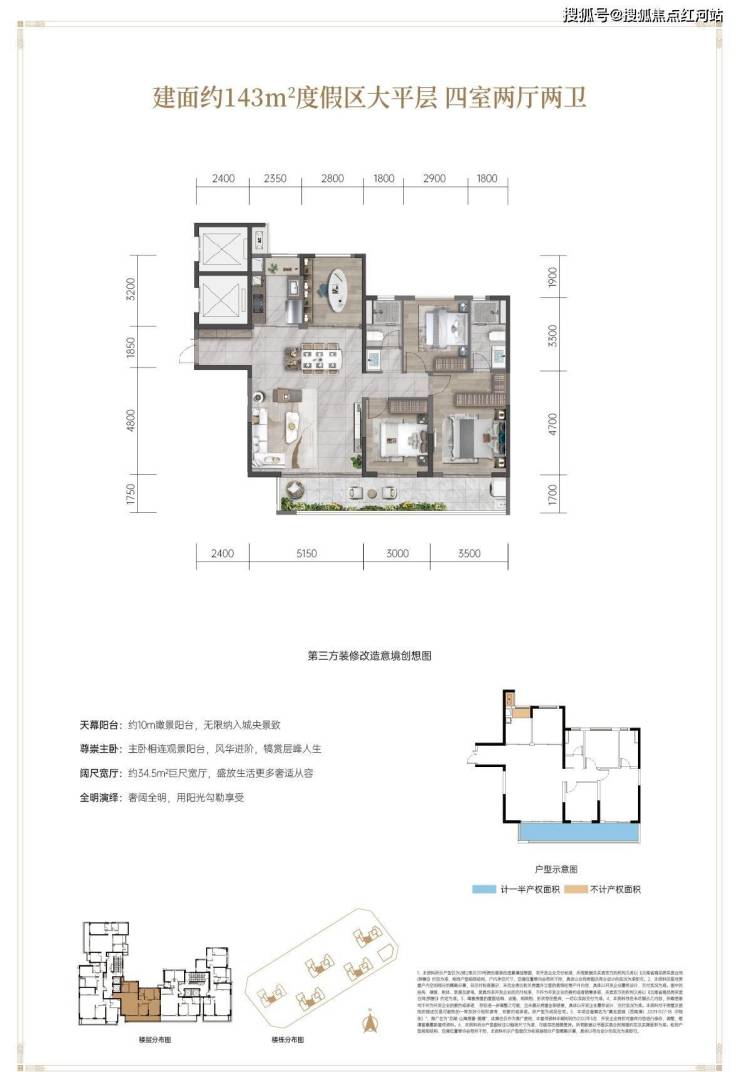 其中,建面约143㎡户型有四个设计,户型通透宽敞,没有连廊,保证最好采光通风;