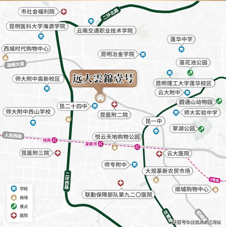 3km 范围内辐射五所大型综合三甲医院:昆明医科大学第一、二、三附属医院,解放军第九二〇医院,昆明安琪儿妇产医院,优质医疗资源全周期守护家人健康。