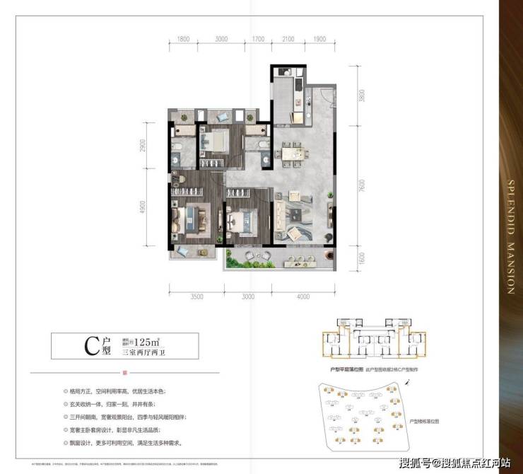 C户型:建筑面积约127㎡,三室两厅两卫