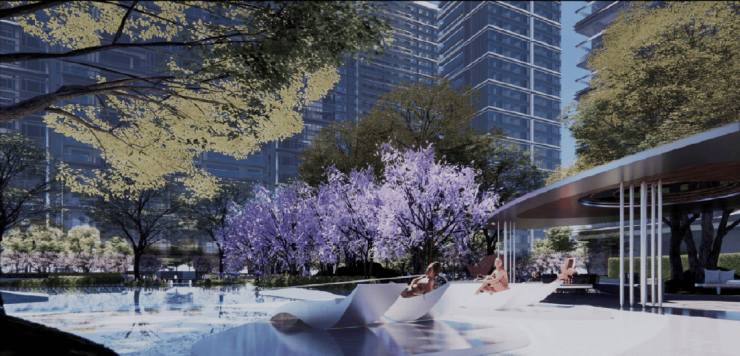五星酒店式环岛落客大门以兰花为原型的不规则泳池微湖景+minibar大堂吧+下午茶结合户外景观和架空层共同打造会客空间、阅读空间、艺术沙龙舒适躺椅+下沉休息区