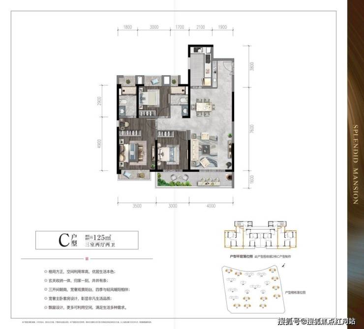 C户型:建筑面积约127㎡,三室两厅两卫