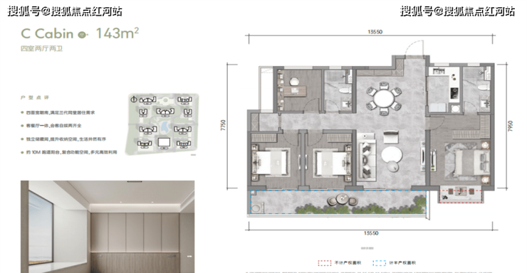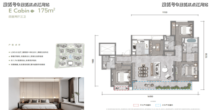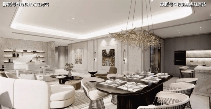 建筑立体线条画框与水晶灰LOW-E构成约0.28+的窗地比,金配白的斜切线条与动态折角设计,大量采用玻璃+铝板的组合,都使得里面像瀑布从天而降般恢弘轻盈,也像镜面的无边泳池垂直倒立,让鳯起蘭庭形成清晰可见的双塔CBD美学群落,打破地标的界限。