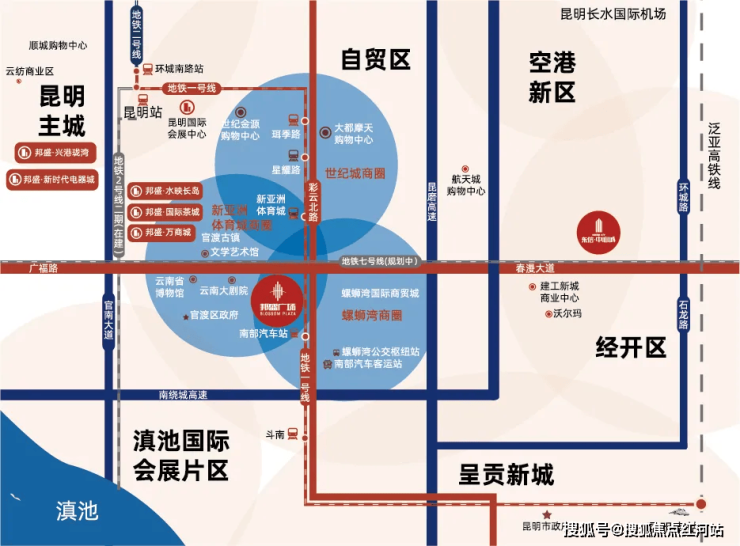 项目位于昆明市广福路与彩云北路交汇处,扼守昆明城市向东、向南发展战略咽喉,是连接昆明老城与呈贡新城的纽带,毗邻昆明CBD核心区域——巫家坝片区及国家级自贸区,占据未来昆明城市与商业发展的战略高地;周边坐拥螺狮湾、世纪城、新亚洲三大商圈,区域人口近百万,几十万待租人口,投资回报有保障;交通便捷,距地铁1号线新亚洲体育城站直线距离600米,7号线正在修建中,立体轨道交通交汇;距昆明高铁南站车程约15分钟,长水国际机场车程约20分钟,南部汽车客运站步行约5分钟,通达全国;地处国家级自贸区,被主城区、经济开发区、滇池会展片区、呈贡新区环绕,属于昆明投资价值洼地。