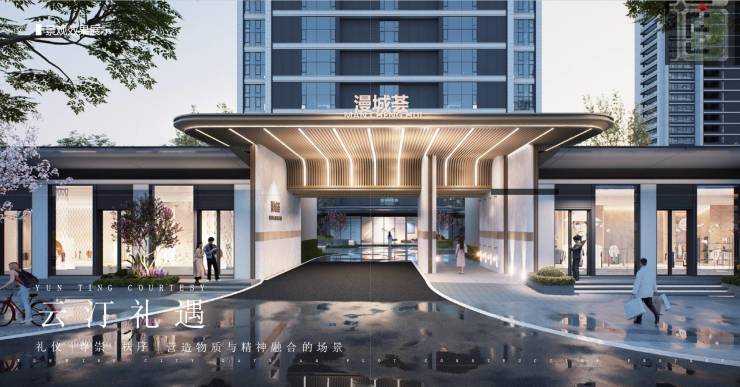 西大门入户充满仪式感,两边矗立着5.4超高的迎宾精致景墙,以及中央迎宾水幕墙,采用层叠水景与艺术雕塑的设计,让业主享受五星酒店的尊贵归家体验。