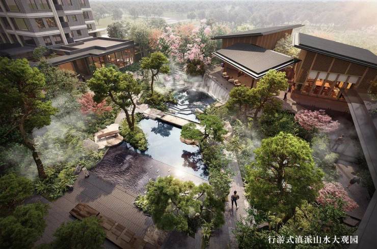 以郭溪的《溪山行旅图》为蓝本,引用三远法构图(高远、深远、平远),还原图中“四周清溪环绕,流水潺潺,中景以水相隔作一岸,岸上山石间杂树繁茂,树林掩映间有亭台楼阁“的壮丽景观。景观融入西华园一颗印围合院落、回廊及流水云台的表达方式,打造可逛、可游、可行、可望、可居的景区式住区体验,为昆明首个行游式滇派山水大观园。
