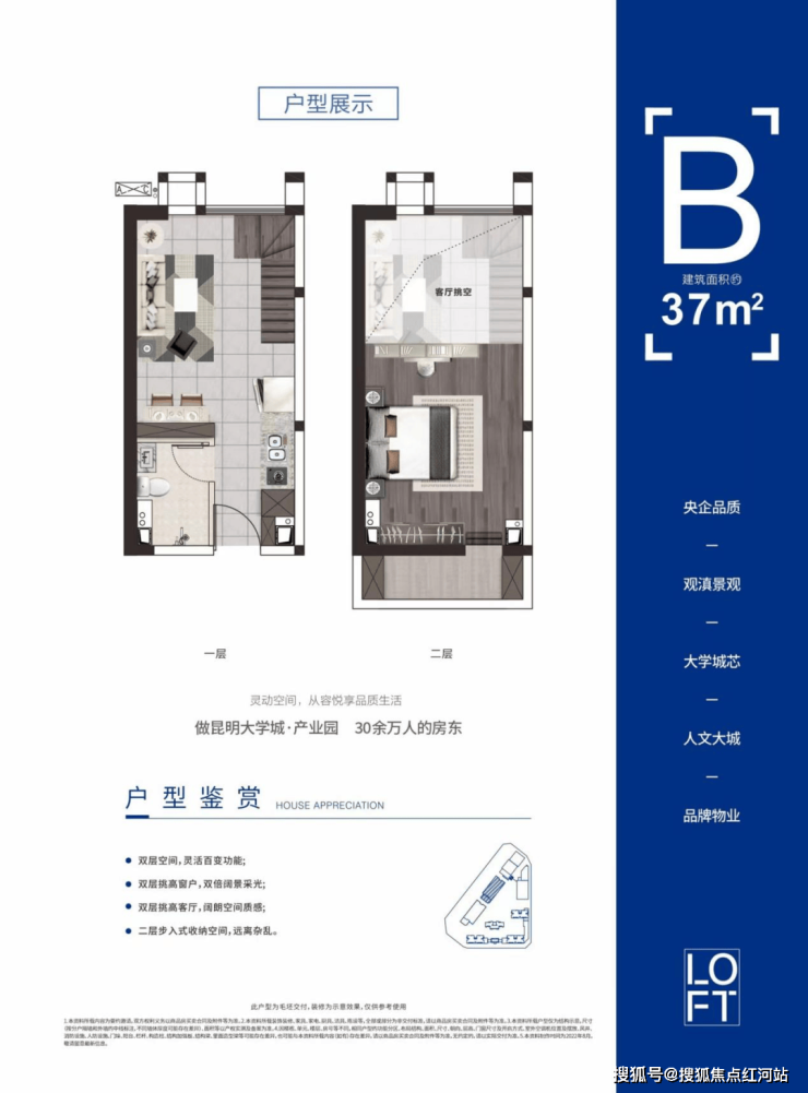 在售37-48㎡1-2房,主力户型为37㎡SOHO、45㎡LOFT、48㎡LOFT双钥匙。SOHO低总价,适配单身居住;LOFT挑高5.4米,买一层得两层,空间利用率高,可自住、可办公、可出租。