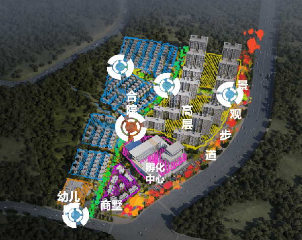 社区内部规划】:两轴:交通轴线分割地块,叠拼产品私密性更佳;景观轴线正对园区主入口,一步一景;一道:景观步道;一溪:水系景观,提升生活品质;八景:独有社区景观打造;九园:切分多个组团,尊贵感及私密性有序提升。