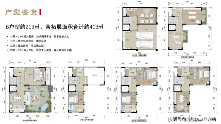 B户型(映岄,约310㎡,产权面积;地上约212㎡,拓展后约413㎡)