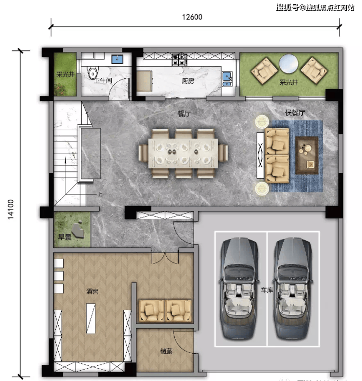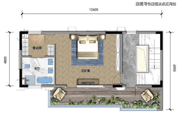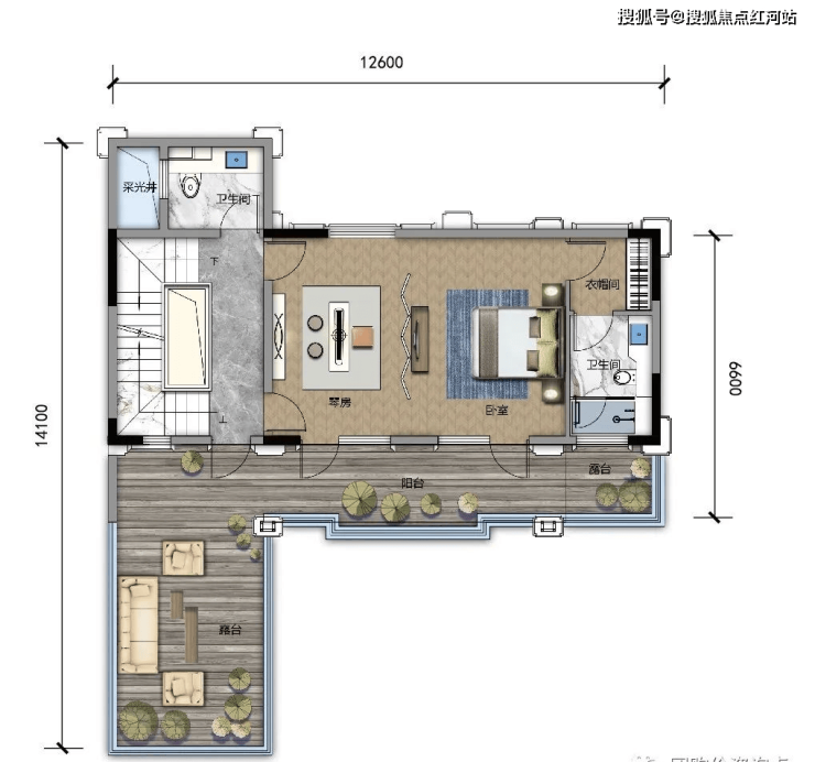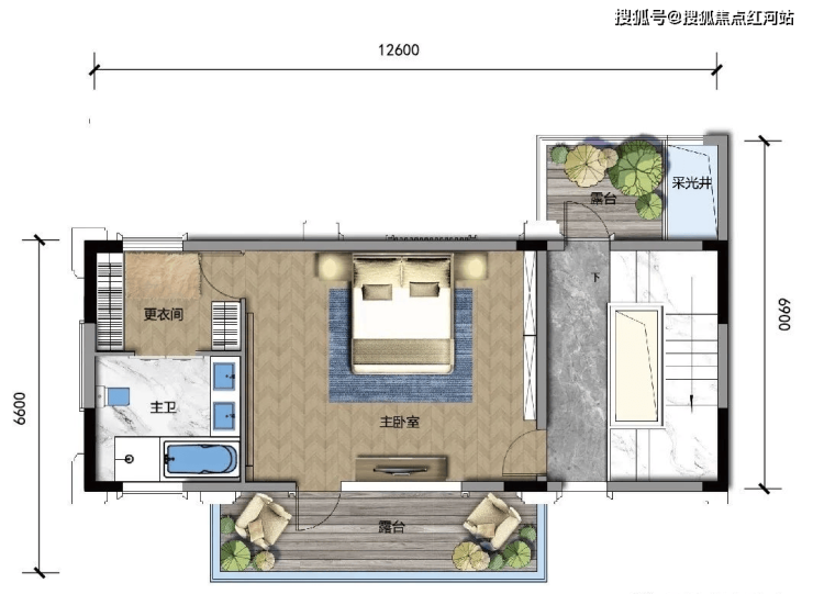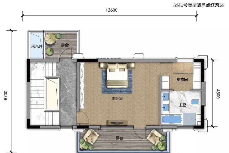 D1 建面约356㎡,露台面积约56㎡,可拓展最大面积约528㎡