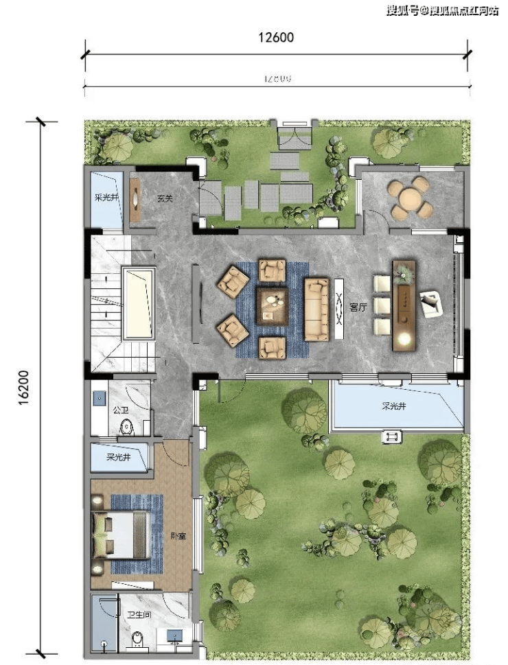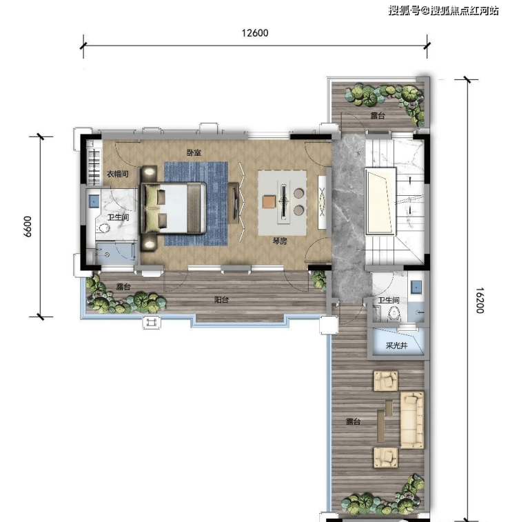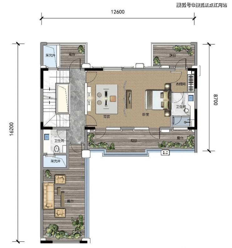 A1 建面约356㎡,露台面积约46㎡,可拓展最大面积约535㎡