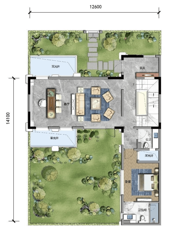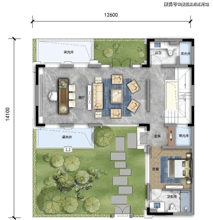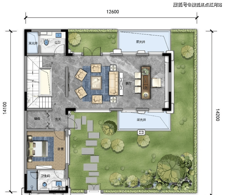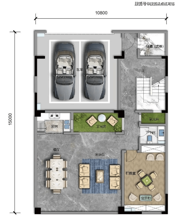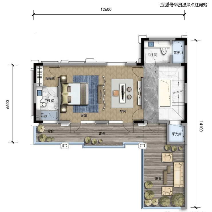 C1 建面约330㎡,露台面积约48㎡,可拓展最大面积约492㎡