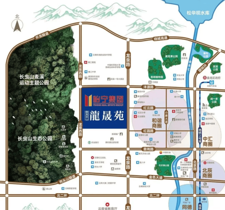 业主子女可直读已开学的盘龙小学御龙半山校区,项目800米范围内还有茨坝幼儿园第一分园(省一级示范园)、昆十中(北市校区),形成从幼儿园到中学的教育闭环。