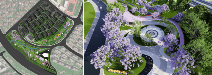 运动体系:600米健康跑道+健身器械区+社区体育场地,地面采用悦动铺装,周边种植大腹木棉、现代月季,运动同时享受花香与绿意。