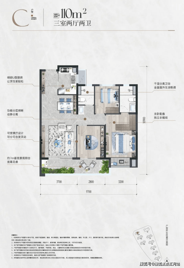 95-110㎡三室:刚改黄金户型,格局紧凑无浪费,双卫设计避免早高峰,三口之家首选