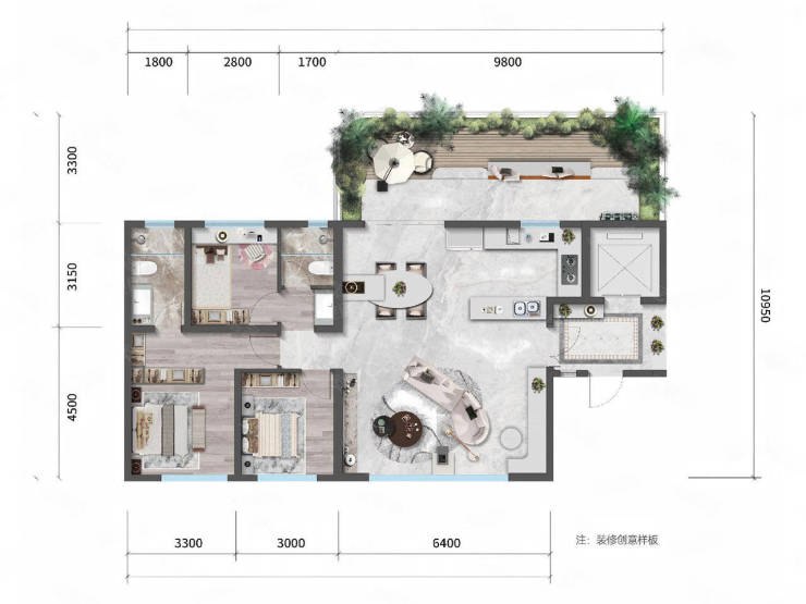 云屿A2户型,建面约107㎡,得房率约130%,X可变空间,可适配不同家庭对居住空间的需求。约9.8米的宽敞露台,庭院生活向空中生长。