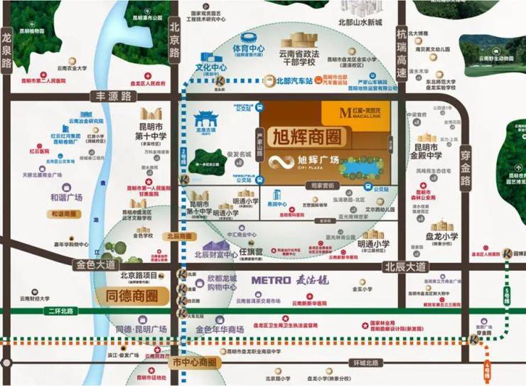 【商业配套】通过北京路可快速到达和谐世纪、北辰、同德等成熟商圈,目前已有沃尔玛、家乐福、麦德龙、北辰财富中心、嘉年华商业区,江东商业街、金江商业美食街等已成熟运营的商业配套。此外,项目品牌自身规划了一个约14.7万方体量的综合商业体——旭辉广场,打造集购物、休闲、娱乐、餐饮为一体的都会生活圈。