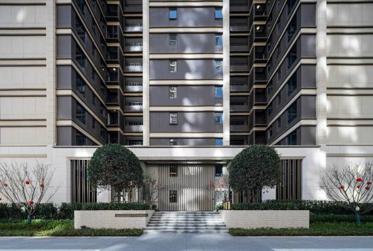 建筑设计采用新中式风格,整体稳重大气、品格高雅。建筑色彩以深灰色和米黄色为主,一洗新中式之冷重,给人以明亮温熹之感。