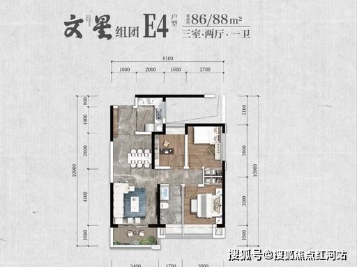 88㎡ E3户型(3室2厅1卫):玄关入户,厨卫全明,南北通透,客餐厅相连,主卧带飘窗;适合预算有限的三口之家