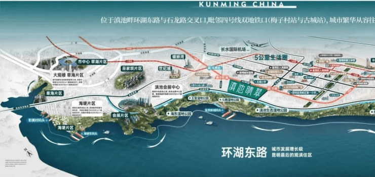 项目坐落于呈贡环湖东路与石龙路交汇处,与滇池湿地仅一路之隔,真正实现了 “一半滇池,一半城” 的滨海生活。项目占据临滇优势,成为不可多得的珍宝。家门口的约108公里滇海绿道,是您散步、慢跑、骑行的绝佳去处。在这里,每一次呼吸都饱含着滇池的温润气息,每一步前行都能邂逅自然的浪漫与惊喜。