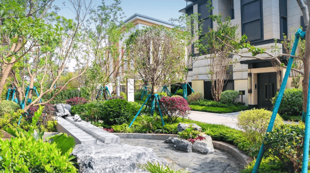 项目以新中式文化意境为形,打造低密山水岛居。整体采用新亚洲建筑风格,干挂石材等材质营造出和谐的视觉层次。小区内有宋式园林,还规划林荫步道等,还原中国传统院落邻里文化。此外,洋房单层高达 3.15 米,合院多套房设计,还有超大私家花园、层层露台阳台赠送,居住舒适度高。