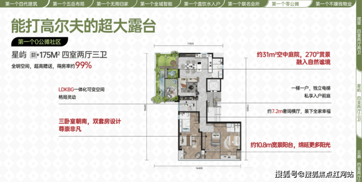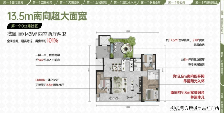 户型主打0公摊、高得房率,户户配备空中花园,实现“把院子搬向天空”;空间布局合理,四室设计满足多成员家庭需求,采光通风俱佳,直饮水入户,居住更健康、更舒适。